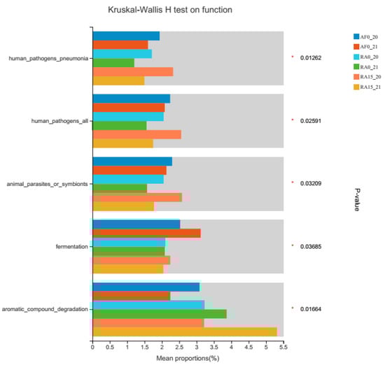 The functions of the soil bacterial community were analyzed by the FAPROTAX program. A total of 55 functional categories related to the bacterial community were obtained. Most of the functional groups were assigned to chemoheterotrophy (35.05%), aerobic chemoheterotrophy (33.22%), nitrate reduction (4.25%), and aromatic compound degradation (3.52%) (Figure S1). The Kruskal–Wallis test was adopted among the treatments (Figure 4). The results revealed that the “aromatic compound degradation” group in the RA15 treatment was significantly higher than that in the AF0 and RA0 treatments (p < 0.05), and the “fermentation” groups in the RA treatments were significantly lower than those in the RA treatment (p < 0.05).