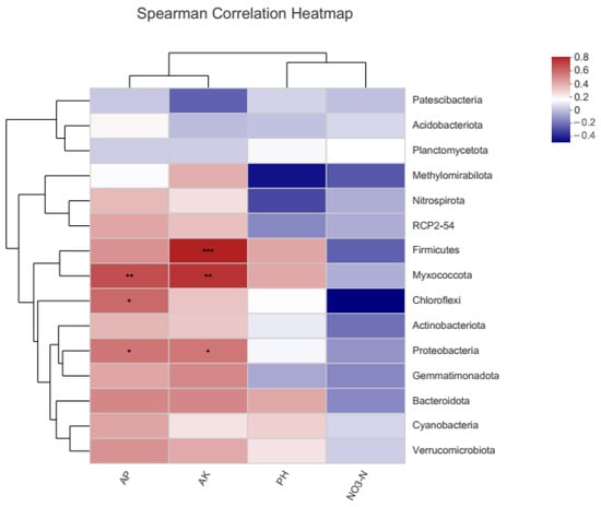Spearman’s test was performed to study the correlation of the environmental factors and the bacterial communities. The results showed that the AP was significantly positively correlated with Myxococcota, Chloroflexi, and Proteobacteria, and the AK was significantly positively correlated with Firmicutes, Myxococcota, and Proteobacteria (Figure 5).
