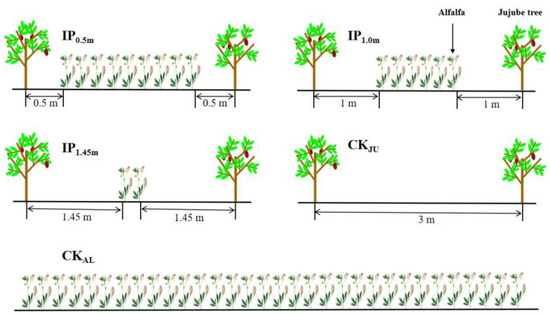 The experiment was conducted between 2013 and 2020, and the data related to soil aggregate and herbage yield were collected in 2020. The Jujube plantation was planted in the spring of 2013 with a row spacing of 1 m × 3 m, and trees were grafted in the spring of 2014. The alfalfa variety ‘Xinjiangdaye’—a large-leaf alfalfa species—was planted between jujube trees in 2014. The following five cropping patterns were used as the layout of the treatments in the experiment: (i)–(iii) the distance between alfalfa and jujube trees was 0.5 m (IP0.5m), 1.0 m (IP1m), and 1.45 m (IP1.45m), with seven, four, and two rows of alfalfa, respectively; (iv) alfalfa sole cropping (CKAL), and (v) jujube sole cropping (CKJU). The row spacing of alfalfa was 30 cm, and the seeding rate was 22.5 kg/ha (thousand-grain weight of 2.42 g). Each treatment was repeated three times (Figure 1), for a total of 15 plots. The area of each plot was 30 m2 (10 m long and 3 m wide). Jujube trees were planted using artificial drilling to a depth of 1–2 cm, whereas the intercropped alfalfa was grown for three years in all treatments. The management practices (irrigation, fertilization, etc.) of the crops were consistent during the study period for all the treatments. Starting from 1 March each year, weeds within 0.5 m of the base of the jujube trees were hand removed every 30 days and buried in the surface soil. Irrigation was provided nine times during the season with 30 mm each time, and the last irrigation (100 mm) was provided in early October before soil froze.