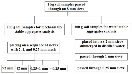 The mechanically stable aggregates were measured using the dry sieving technique [31]. An amount of 100 g of air-dried soil aggregates were separated by placing them on a sequence of sieves with 2, 1, and 0.25 mm mesh openings (Figure 2). Each sieve was manually shaken at a rate of 30 times per minute (with a 5 cm amplitude) for 2 min. The various size fractions of soil aggregates were gently removed from the sieves, collected, and weighed. The soil water-stable aggregates were measured using the wet sieving technique [32]. Three sieves were used for the aggregate size distribution (2, 1, and 0.25 mm). An amount of 100 g of each soil sample was placed into a 2 mm sieve and submerged in distilled water for five minutes. After the slaking process, manual wet sieving was performed. The soil aggregates were oscillated in water at 50 cycles for 2 min and passed through progressively smaller sieves (i.e., 1 and 0.25 mm mesh sizes). After the oscillating process, the remaining soil aggregates on each mesh screen were washed from the sieves into aluminum pans, oven-dried at 50 °C for 24 h, and weighed. The aggregate stability was expressed as the mean weight diameter (MWD) (Equation (1)) comprising the sum of the mass fraction remaining in each sieve multiplied by the mean aperture of the adjacent mesh: