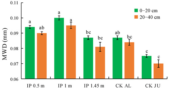The MWD of the soil mechanically stable aggregates were higher under IP0.5m, IP1m, IP1.45m, and CKAL than CKJU (Figure 5). Compared with CKJU, the herbage treatments significantly increased the MWD values of the soil mechanically stable aggregates. The MWD under IP1.45m in the 0–20 cm and 40–60 cm soil layers were lower than those under CKAL, thereby indicating that the effect of CKAL on improving the MWD of the soil mechanically stable aggregates was slightly inferior to that of CKJU. The MWD of the soil mechanically stable aggregates followed the order of IP1m > IP0.5m > CKAL > IP1.45m > CKJU. Therefore, IP1m had the greatest effect on consolidating the soil’s mechanically stable aggregates.