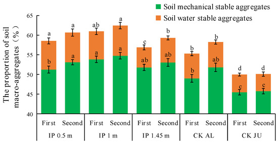 The concentrations of mechanically stable macro-aggregates > 0.25 mm accounted for about 50% of the total in all treatments (Figure 7). However, the concentrations of soil water-stable aggregates were very low and they only accounted for 4–8% of the total. In the first full-bloom stage, the highest concentration of mechanically stable macro-aggregates was obtained under IP1m, and it was significantly higher than those under CKAL and CKJU. The second highest was obtained under IP1.45m, but IP0.5m only slightly increased the concentration of mechanically stable macro-aggregates. The lowest concentration was obtained under CKJU. In the second full-bloom stage, the concentrations of mechanically stable macro-aggregates increased to varying degrees under the four herbage treatments, whereas there was no obvious change under CKJU.