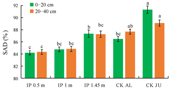 SAD is one of the key indexes used to evaluate the stability of soil aggregates and the overall soil structure. The soil structure is more stable when the SAD values are smaller. In the 0–20 cm soil layer, the SAD values significantly differed between the herbage treatments and CKJU, where they were significantly lower under IP0.5m, IP1m, IP1.45m, and CKAL than CKJU (Figure 8). The SAD value was lowest under IP0.5m and significantly lower than that under IP1.45m, followed by IP1m. The SAD value was highest under IP1.45m among the herbage treatments. The differences in the SAD values between the herbage treatments and CKJU gradually narrowed as the soil depth increased. The SAD values did not significantly differ in the 20–40 cm soil layer under IP1.45m, CKJU, and CKAL. The SAD value was lowest under IP0.5m, followed by IP1m. Thus, IP0.5m and IP1m effectively enhanced the stability of the soil structure.
