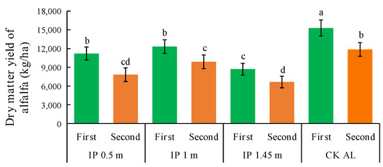 The dry matter yield of alfalfa was significantly higher under CKAL than the other treatments (Figure 9). The second highest yield was obtained under IP1m and it was significantly higher than those under IP0.5m and IP1.45m. The dry matter yields under each treatment were significantly higher than that under IP1.45m. Thus, the intercropping configuration was not effective under IP1.45m and the alfalfa yield increase was significantly lower than those under other treatments. The dry matter yields in the second full-bloom stage decreased to different degrees compared with those in the first full-bloom stage. The yield was significantly higher under IP0.5m than the other treatments and was still the lowest treatment under IP1.45m. IP0.5m was most effective at increasing the dry matter yield, followed by IP1m. The yield in the first full-bloom stage was much higher under IP0.5m than the other herbage treatments. In the second full-bloom stage, the highest decrease in the yield occurred under IP0.5m, and thus the increase in yield was most unstable under this treatment. In the first full-bloom stage, the lowest yield occurred at IP1m compared with the other herbage treatments. In the second full-bloom stage, the decrease in the yield was lowest under IP1m, and thus the increase was most stable. The total annual yields under all treatments followed the order of CKAL > IP1m > IP0.5m > IP1.45m. Thus, CKAL was most effective at increasing the alfalfa yield.