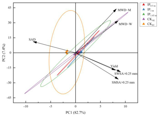 The two main principal components (PC) 1 and 2 were selected with an explanation of 82.7% and 7.4%, respectively (Figure 10). SWSA > 0.25 mm has the largest load coefficient in PC1 and the highest contribution to PC1, followed by SMSA > 0.25 mm. The contribution of MWD-M to PC2 was the largest, and SAD was the smallest. PCA also reflected the relationship between the spacing treatment and each principal component. The distribution of IP1.45m treatment and CKAL treatments was almost the same, indicating that the difference between the two treatments is very small. IP0.5m and IP1m treatments were positively correlated with PC1, indicating that IP0.5m and IP1m treatments had a positive effect on PC1. CKJU treatment had a negative effect on PC1 and a positive contribution on PC2. It suggested that PC1 was greatly affected by IP0.5m and IP1m treatments, and PC2 was most affected by CKAL treatment. The correlation analysis revealed that alfalfa yield was strongly positively correlated with SWSA > 0.25 mm, SMSA > 0.25 mm, MWD-M, and MWD-W (Figure 11). This indicates that changes in alfalfa yield were mainly driven by soil aggregates. In the alfalfa-jujube tree intercropping system, spacing configurations have a significant effect on alfalfa yield by changing the soil aggregate distribution and proportion, especially changing soil macro-aggregates.