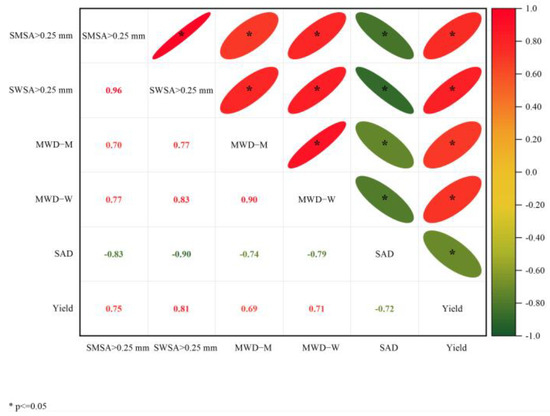Correlation analysis between soil aggregate parameters and alfalfa yield in alfalfa-jujube tree intercropping systems. MWD of soil mechanically stable aggregates (MWD-M); MWD of soil water-stable aggregates (MWD-W); soil aggregate destruction rate (SAD); mechanically stable soil macro-aggregates (SWSA > 0.25 mm); water-stable soil macro-aggregates (SMSA > 0.25 mm).