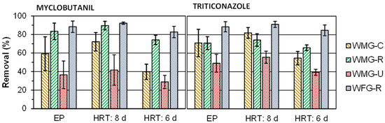 - Gikas, G.D.; Pérez-Villanueva, M.; Tsioras, M.; Alexoudis, C.; Pérez-Rojas, G.; Masís-Mora, M.; Lizano-Fallas, V.; Rodríguez-Rodríguez, C.E.; Vryzas, Z.; Tsihrintzis, V.A. Low-cost approaches for the removal of terbuthylazine from agricultural wastewater: Constructed wetlands and biopurification system. Chem. Eng. J. 2018, 335, 647–656. [Google Scholar] [CrossRef]