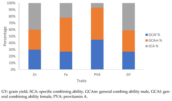 The contribution of GCA male to the total sum of squares for hybrids was 30% for Zn, 51% for Fe, 48% for PVA and 32% for grain yield, while the contributions of GCA female was 30% for Zn, 27% for Fe, 45% for PVA and 27% for grain yield (Figure 1). The contribution of SCA effects to the total sum of squares was 40% for Zn, 22% for Fe, 7% for PVA, and 41% for grain yield. Some inbred lines combining positive GCA and SCA effects for multiple micronutrients and grain yield were identified (Table 4 and Table S3). Inbred line 16 combined positive GCA effects on Fe, Zn, PVA contents and grain yield. This inbred line accumulated 35.33 mg kg−1 of Zn, 27.89 mg kg−1 of Fe and 9.31 μg g−1 of PVA (Table 1). Inbred lines 1 and 5 had positive GCA for Zn, Fe and grain yield, whereas inbred line 23 displayed positive GCA effects for PVA and Fe levels. In contrast, inbred lines 2, 15 and 24 combined negative GCA effects for the three micronutrients. Eleven hybrids combined positive SCA for Zn, Fe and PVA levels, whereas five hybrids combined positive SCA effects for Zn and Fe levels. Three hybrids combined positive SCA effects for Zn and PVA, while two hybrids combined positive SCA for PVA and Fe content.
