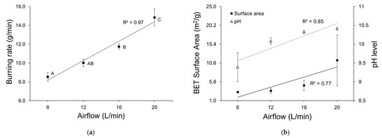 Airflow effect on: (a) gasification burning rate; (b) wild sugarcane biochar pH and BET surface area. Different letters indicate a significant difference.