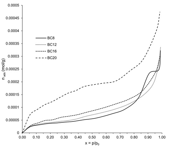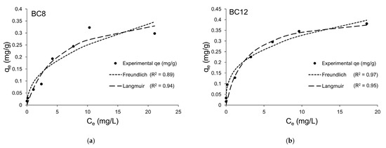 The atrazine adsorption isotherms are shown in Figure 8, while Table 4 shows the isotherm parameters. The maximum atrazine adsorption capacities were BC8 (0.41 mg/g), BC12 (0.42 mg/g), BC16 (0.28 mg/g), and BC20 (0.22 mg/g). BC8 (R2 = 0.94), BC16 (R2 = 0.96), and BC20 (R2 = 0.98) were better described by the Langmuir isotherm, suggesting monolayer adsorption for these biochar samples [15]. The Langmuir isotherm had a close approximation for BC12 (R2 = 0.95), but the Freundlich isotherm better described the process (R2 = 0.97). Therefore, BC12 might present multilayer, heterogeneous adsorption. The values of K.F followed the highest (BC12) and lowest (BC20) adsorption capacity. This behavior coincides with the amount of organic and fixed carbon in both biochars, hinting that WSB organic carbon might play a crucial role in organic compounds’ sorption [39].
