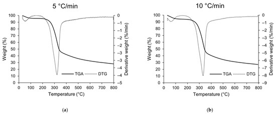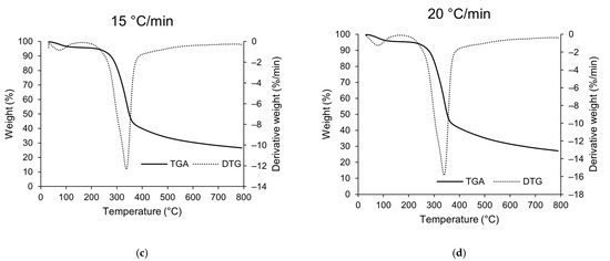 Wild sugarcane biomass thermogravimetric analysis and derivative thermogravimetric at heating rates of: (a) 5 °C/min; (b) 10 °C/min; (c) 15 °C/min; (d) 20 °C/min.