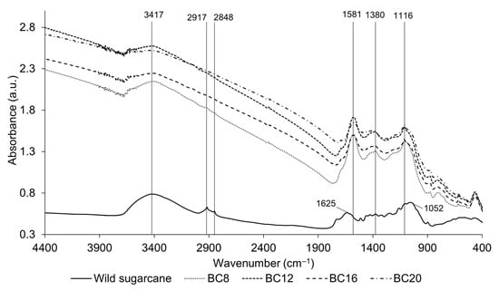 Figure 6 shows the results of the FTIR analysis of wild sugarcane feedstock and biochar. The feedstock presented peaks at 3417 cm−1 that correspond to the alcohol/phenolic O-H stretching, which is supposed to be 3200–3550 cm−1 [32]. Additionally, the results presented peaks at 2918, 2848, 1625, and 1052 corresponding to asymmetric C-H stretching, symmetric C-H stretching, aromatic C=C carbon stretching, and C-O stretching of alcohol [33,34,35,36]. Upon gasification, the absorbance of the O-H stretching at 3417 cm−1 increased. This could be due to the increase in temperature [32]. Furthermore, peaks at 1581 cm−1 appeared at all biochars. These peaks correspond to carboxylic acid stretching vibration [37]. The gasification of wild sugarcane also increased the absorbance of aliphatic CH3 deformation, which presented at 1380 cm−1 [36]. P-O stretching peaks appeared after gasification at 1116 cm−1 [38]. The peaks at 2917 and 2848 cm−1 disappeared after gasification, which indicates the instability of C-CH3 links [32].