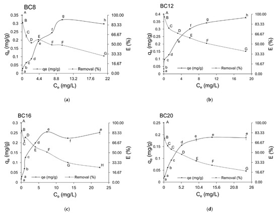 Removal efficiency (E) and experimental qe for: (a) BC8; (b) BC12; (c) BC16; (d) BC20. Uppercase and lowercase letters indicate significant differences among E and qe, respectively.