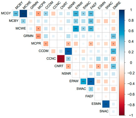 Pearson correlation coefficient (r) showing the relationships between cover crop performance indicators and fallow soil water and mineral N dynamics and legacy impacts on subsequent cash crop productivity and profitability. MCGY = cash crop grain yield (kg ha−1); MCBY = cash crop biomass yield (kg ha−1); MCWE = cash crop water use efficiency (kg ha−1 m−1); GRMN = farm gross margin ($ ha−1); MCPR = cash crop grain protein (%); CCDM = cover crop biomass (kg DM ha−1); CNCC = biomass N concentration (%); CNRT = biomass C/N ratio; NSNR = Biomass retention and supply (kg N ha–1); EPAW = soil water at end of fallow (mm); SWAC = soil water accumulation between cover crop termination and cash crop sowing (mm); FAEF = fallow efficiency (%); ESMN = soil mineral N content at cash crop sowing (kg N ha−1); SNAC = soil mineral N between cover crop termination and cash crop sowing (kg N ha−1); and DMRE = cover crop residue remaining at cash crop sowing (%). * Significant at p < 0.05; ** Significant at p < 0.01.