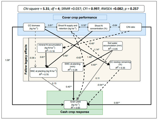 A structural equation modelling (SEM) approach was utilised to model the covariances in relationships between cover crop properties and cash crop yield, as mediated through changes in fallow soil water and mineral N (Figure S1). The SEM was conducted on the same studentised residuals extracted from the full LME models. By removing the effects of cover crop treatment, cash crop identity, and year, the SEM analysed the effects of intrinsic cover crop properties without influence of cover crop and cash crop identities and differences in seasonal conditions. We excluded the fallow and the stubble treatment from this analysis because they had no input values for cover crop biomass and quality parameters. We started with a priori global model based on the hypothesis that cash crop productivity (grain yield and protein content) is influenced by cover crop performance and fallow, as well as through direct and indirect effects on fallow soil water and mineral N dynamics. The global model was then refined into a more parsimonious model by assessing the ‘goodness of fit’ of the model using Chi-squared (χ2) maximum likelihood; comparative fit index (CFI); root mean square error of approximation (RMSEA); and standardised root mean square residual (SRMR) [36,37]. An SEM is considered to have a good fit when RMSEA < 0.05; SRMR < 0.08; CFI > 0.95 and Fisher’s p-value is 0.05 < p ≤ 1.00, based on the χ2 statistic [38]. The SEM was conducted using the “lavaan” package [39] implemented in “jamovi” (https://www.jamovi.org) open-access software (accessed 19 December 2022). All figures were produced using the “ggplot2” package [40].
