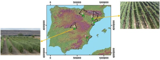 Plot location on Iberian Peninsula map: (a) Cadreita (Navarra); (b) Torres del Segre (Lleida); (c) Constantí (Tarragona); (d) Colmenar de Oreja (Madrid); and (e) Villena (Alicante). Two pictures of the Madrid and Lleida olive orchards are shown.