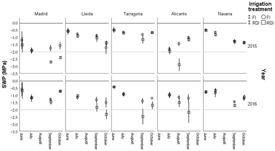The limit of high stress (SWP < −3.5 MPa) was not achieved at any time. This value is considered a critical threshold that, if crossed, would cause damage to the photosynthetic apparatus [16]. Only a few measures from mid to the end of the irrigation season in Madrid, Lleida, Tarragona, and Alicante olive groves under RDI treatment dropped below the −2.0 MPa threshold, which is considered the limit of moderate stress. Gómez del Campo (2013) [19] determined that below −2.0 MPa in August reduces oil production and Hueso et al. (2019) [20] fixed on the limit of −2.21 MPa, which was crossed by the Alicante trial in 2015.