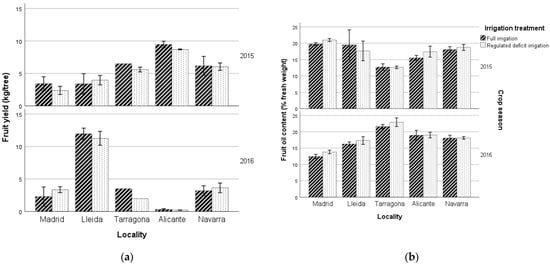 Fruit yield (a) and fruit oil content (b) under irrigation treatments (FI: full irrigation; RDI: regulated deficit irrigation) in both years and plot location (n = 4). Vertical error bars represent the mean standard deviation.