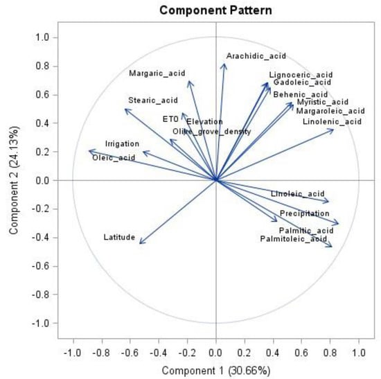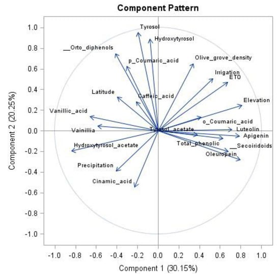 Due to the high weight of the olive orchard’s locality in VOO composition, a principal component analysis (PCA) was carried out using the SAS (Statistical Analysis Software), Version 9.4 (Cary, NC: SAS Institute Inc.) and including the main meteorological data (yearly rainfall, yearly ETc, and yearly irrigation) of each crop season and some orchard characteristics (latitude, density, and elevation) to establish which of these factors are more related to the different phenolic compounds, sterols, and triterpenes dialcohol, and fatty acids composition.
