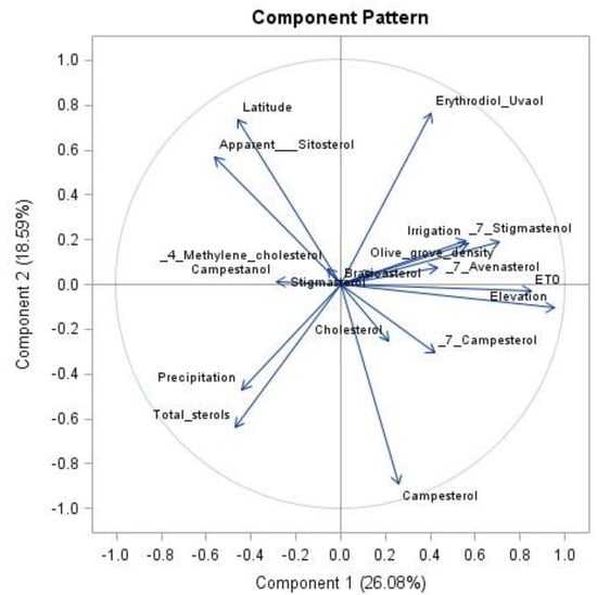 A PCA biplot including the main meteorological data (yearly rainfall, yearly ETc, and yearly irrigation) of each crop season, orchard characteristics (latitude, density, and elevation), and the sterols and triterpenes dialcohols compositions is shown in Figure 5. Axis 1 explained 26.08% of the total variance and axis 2 explained 18.59%. The lower the latitude, the higher the campesterol percentage and lower apparent β-sitosterol in EVOOs. A high level in total sterols is related to rainy years and areas, as was previously reported by Arbones et al. [49].