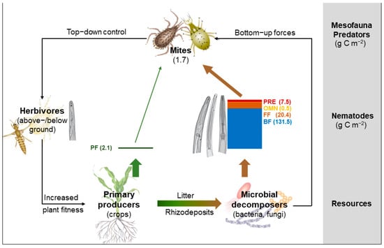 Microarthropods with their high degree of omnivory and multi-channel feeding across energy sources, are key components of sustainable biological control strategies [18]. In particular, mites function as trophic-level omnivores and form a feeding gradient rather than a discrete trophic group [1]. Generally, biocontrol approaches are designed as top–down control of the prey (pest) by the predator (or parasite). The opposite way, i.e., bottom–up forces along the food chain, leading to increased fitness and improved biocontrol function of a predator, have received very little attention. Only recently, the trophic link between predatory mites and free-living nematodes (FLN) as complementary prey has been shown to improve the efficacy of mites as biocontrol agents [22,23,24]. This highlights that biological pest control by soil fauna predators should be viewed within the framework of such interactivity.