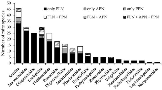 Laelapidae and Macrochelidae are the families with the second-highest number of nematophagous species (both with 30 species, Figure 2). For both families, most of the reports involve FLN. However, there are more reports of species consuming APN and PPN in Laelapidae than in Macrochelidae (Table S1, Figure 2).