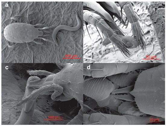 - Lindquist, E.E.; Krantz, G.W.; Walter, D.E. Order Mesostigmata. In A Manual of Acarology; Krantz, G.W., Walter, D.E., Eds.; Texas Tech University Press: Lubbock, TX, USA, 2009; pp. 124–232. [Google Scholar]