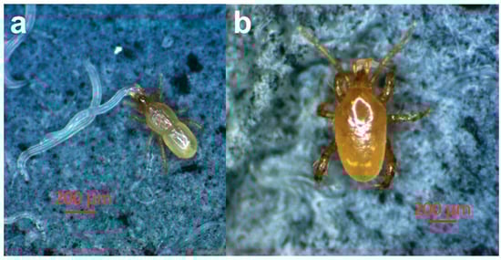 Within mites, Mesostigmata, and especially the family Phytoseiidae, are already widely used for control of above-ground agricultural pests. The most well-known are specialist species, having one prey (e.g., Phytoseiulus persimilis Athias-Henriot), while some generalists (e.g., Amblyseius swirskii Athias-Henriot) have gained prominence because they can be used for several prey species and also perform well with additional alternative food [2,3,4]. The same cannot be said for below-ground systems. Despite their known diversity and predatory capacity, only a few soil mite species are used in the biological control of pests, even though below-ground pests, in particular plant-parasitic nematodes, are responsible for severe crop damage in agricultural systems [5]. While soil Mesostigmata mites are mostly generalists, many of them have a preference for free-living nematodes [6,7,8].