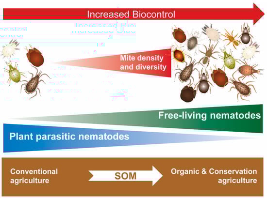 Future research should study soil mite and nematode assemblages in different cropping systems, soils, and climate zones. Soil degradation is recognized as a global threat and soil organic matter depletion is a significant factor in this. Novel conservation soil management strategies will aim at increasing soil organic matter and reducing soil erosion and compaction. Future research should assess how these management strategies will improve soil health and biodiversity, which largely include mites and nematodes. Harnessing the local biodiversity can favor the increase and sustainability of biological control agents and favor the restoration of soil food webs (Figure 5). Strategies may include the use of organic amendments derived from animal feed production and or composting, which increase the accumulation of soil organic matter and in turn foster soil life as well as biocontrol.