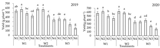 The yields of the green peppers in 2019 and 2020. Bars stand for standard error of the mean difference. Different small letters above the bars indicate a significant difference for various water levels and N treatments at p < 0.05 according to an LSD test within same year.