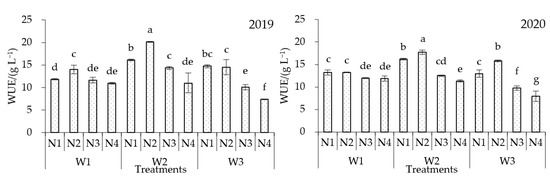 The highest WUE values, 20.14 and 17.71 g L−1, respectively, were obtained in the W2N2 treatments, while the lowest values, 7.38 and 7.95 g L−1, respectively, were obtained in the W3N4 treatments for both two years.