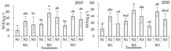 The nitrogen use efficiency of the green peppers in 2019 and 2020. Bars stand for standard error of the mean difference. Different small letters above the bars indicate a significant difference for various water levels and N treatments at p < 0.05 according to an LSD test within same year.