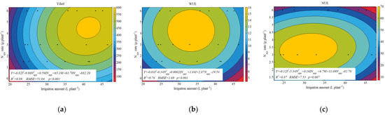 According to the formulas in Figure 5, the relationship models of yield, WUE, and NUE with irrigation amount and Napp rate could be obtained. When the irrigation amount and Napp rate were about 38~44 L plant−1 and 3.8~5.4 g plant−1, 27–40 L plant−1 and 2.4~6.0 g plant−1, 27–37 L plant−1 and 2.3~4, 4 g plant−1, the yield, WUE, and NUE were at a high level (Figure 5).