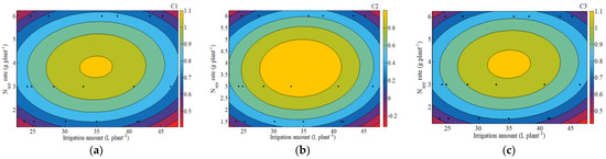 Assume that the yield, WUE, and NUE have the same weights for the three combinations (Equations (4)–(6)), then the targets of C1, C2, and C3 and the corresponding I and Napp rate could be obtained (Figure 6). These three combinations could be used for target optimization. Although the WUE and NUE achieved the maximum value in C1 combination, the yield decreased by 7.63% compared with the maximum value. Compared with C3, when the irrigation amount of C2 increased from 34.63 to 36.09, the yield increased only by 15.02 g, and the WUE and NUE of the C2 combination were also higher than those of C3 combination, so it can be considered that the C2 combination was the best (Table 6).