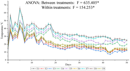 Dynamics of temperature among various composting treatment groups. ‘*’ indicates a significant difference at p < 0.05 by ANOVA.