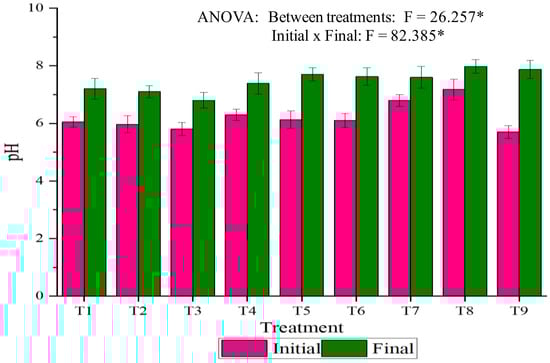 The initial pH of the treatment mixtures ranged between 5.70 and 7.18, and increased (ranging between 6.80 and 7.98) by the end of the composting process. The ammonization and volatilization reaction during the biodegradation followed by the emission of greenhouse gases led to this increased pH [25,35,36]. From Figure 2, it can be observed that in the treatments without biochar, the pH is slightly acidic, which is not favorable to the composting process and can result in poor-quality compost. The initial pH of the treatments without biochar is inversely proportional to the concentration of food waste and directly proportional to the concentration of manures. This could be because of the alkaline nature of the chicken manure and swine manure. However, the addition of biochar to the composting mixture increased the initial pH. This shows that biochar used as a bulking agent assisted in attaining an alkaline pH in the reaction at the initial stages itself. Previous studies have reported that a pH ranging from 7.0 to 8.5 with 12% biochar provides ideal conditions for biodegradation by microbes [24]. We attained favorable pH values with 5% biochar, which was likely due to the selection of feedstock proportions.