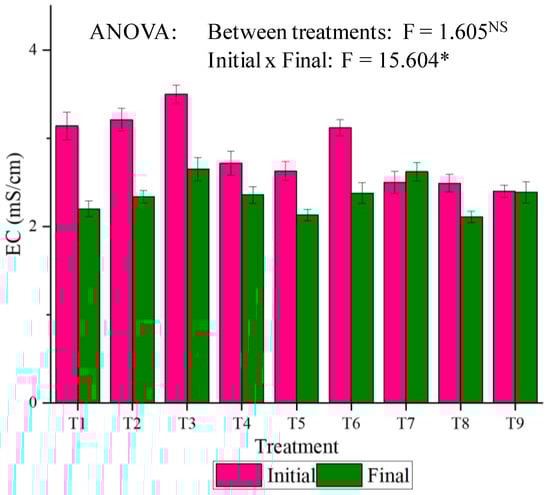 The toxicity of salts and the suitability of compost for agricultural purposes can be evaluated by measuring the electrical conductivity (EC) [37,38,39]. In our study, the initial EC was found to be very high in treatments without biochar amendment, whereas the EC of the treatments with biochar was comparatively low (Figure 3). During the final stage of composting, the EC of all the treatments decreased and was in the range of 2.11–2.65. The decrease in the EC value was due to the precipitation and volatilization of salts and ammonia, respectively [40]. The EC observed in our results was in the permissible ranges of agricultural applications and in agreement with previous reports [30,41].