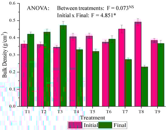Previous studies have reported the importance of bulk density and total porosity in regulating the composting process [42]. Bulk density is an important parameter to be monitored in composting experiments; it should decrease over the period of composting as it reaches maturity [43]. In Figure 4, it can be observed that the initial bulk density of the treatments without biochar decreases with the increase in the proportion of food waste. In biochar-amended treatment groups, however, the initial bulk density was comparatively higher than those without biochar. At the final stage of composting, as the compost matured, in the treatments without biochar, the BD significantly increased p < 0.05, whereas the BD of the biochar-amended groups, T8, T7, T5, and T4, decreased significantly (53.05%, 39.25%, 21.71%, and 18.47%, respectively, data not shown) p < 0.05. In T9, where the composting mixture carried 5% biochar, the percentage reduction in BD was 4.68%, which was not observed in T6 (with 3% biochar amendment), indicating that the biochar percentage was not sufficient in T6. The final BDs of treatments with the biochar amendment were found to be 0.331, 0.321, 0.392, 0.274, 0.231 and 0.367 g/cm3, which are within the optimal conditions of <0.4 g/cm3. However, in the treatments without biochar (T1–T3), the BD was not in the optimal range indicating that the compost is not suitable. The increase in BD in treatments without biochar was because of the short thermophilic phase followed by a decline in the temperature (as observed in the temperature trends). Prior studies have mentioned that amendments such as the addition of bulking agents to the compost feedstock help to maintain the BD by augmenting the gaseous exchanges and aeration. This retains the nutrients and enhances the quality of the compost [44,45]. The compost product with a low BD indicates high porosity, which is in agreement with our results of total porosity.