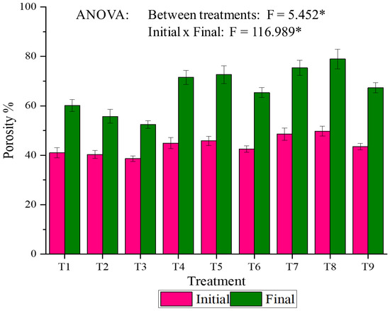 Profile of total porosity variations among different composting treatment groups. ‘*’ indicates a significant difference at p < 0.05 by ANOVA.