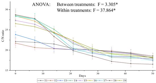 Profile of C/N ratio variations among different composting treatment groups. ‘*’ indicates a significant difference at p < 0.05 by ANOVA.