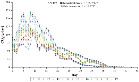 Profile of CO2 emission (g/day) variations among different composting treatment groups. ‘*’ indicates a significant difference at p < 0.05 by ANOVA.