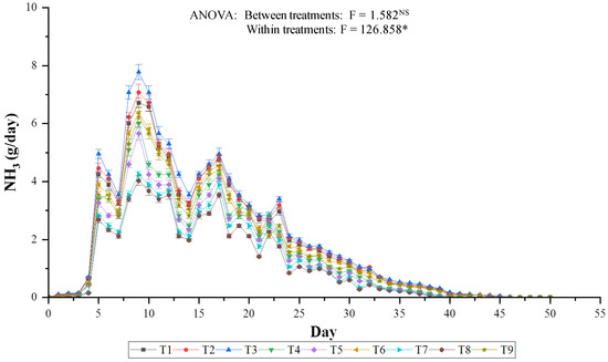 Profile of NH3 emission (g/day) variations among different composting treatment groups. ‘*’ indicates a significant difference, and ‘NS’ indicates a non-significant difference at p < 0.05 by ANOVA.