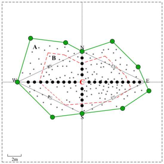 In this study, the forest gap represents extended forest gaps (Figure 1). An extended forest gap resembles a polygon enclosed by all border trees, and the center of gravity of the polygon is used as the center of the gap to establish a coordinate system. The forest gap size was calculated using the Helen formula because the gaps were almost polygonal. The total triangular area formed by the center of the gap and the border trees was used for calculation. The gap size was calculated using Formulas (1) and (2):