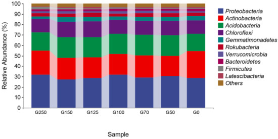 After the individual quantification step, the amplicons were pooled in equal amounts, and pair-end 2 × 250 bp sequencing was performed using the Illlumina NovaSeq platform with the NovaSeq 6000 SP Reagent Kit (500 cycles) at Shanghai Personal Biotechnology Co., Ltd. (Shanghai, China). Using QIIME2 software (version 2019.4, https://qiime2.org/, accessed on 1 October 2022), the microbiome bioinformatics of each sample was performed [23]. The raw sequence data were demultiplexed using the demux plugin, followed by primers cutting with the cutadapt plugin [24]. Our raw data were uploaded to NCBI database (serial number: PRJNA792800). The high-quality tag data (clean tags) were obtained using the DADA2 method when the raw sequences were quality filtered, denoised, merged, and the chimera removed [25]. Assemblages were clustered at a 100% similarity level and defined as amplicon sequence variants (ASVs) using DADA2 [26]. The ASVs were taxonomically annotated based on the Greengenes (bacteria) taxonomic databases [27]. Rarefaction curves were constructed using the number of sequences drawn and the number of ASVs they represented. The sparsity curve entered a plateau (Figure S1), indicating that the sequencing depth was sufficient to reflect the actual soil microbiota.