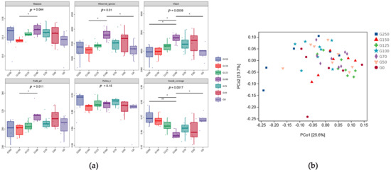 Significant differences were detected in the Shannon, Chao1, observed species richness, and Faith PD indices in the soil bacterial community among different-sized forest gaps (p < 0.05), which initially increased and subsequently decreased with the increasing gap size. The highest Shannon, Chao1, observed species richness, and Faith PD indices were found in the G100 group (Figure 3a). The Venn diagram indicated that the G100 group contained more unique ASVs (8827), as compared with other groups (Figure S2). Based on weighted UniFrac distance, PCoA revealed 25.6% variation along the first axis and 13.7% variation along the second axis. The results are shown in Figure 3b and Table S1. All the samples were clustered, and compositional differences were evident among different groups (ANOSIM R = 0.173, p < 0.001; ADONIS R2 = 0.195, p < 0.001), which indicated that the grouping was reasonable.