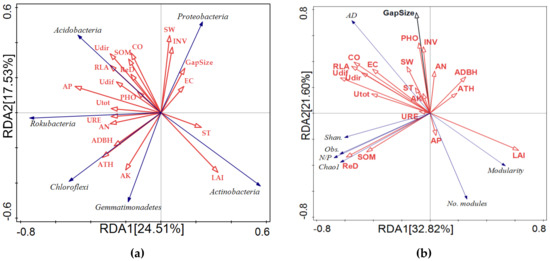 (a) Constrained ordination analysis of bacterial community composition with gap-related microenvironmental factors; (b) constrained ordination analysis of bacterial community diversity, and network structure with gap-related microenvironmental factors. Notes: (a) the relationships between gap-related microenvironmental factors (red arrows) and dominant phyla (blue arrows); (b) the relationships between gap-related microenvironmental factors (red arrows) and alpha diversity indices and network topological characteristics indices (blue arrows). Note: AD, average degree; N/P cohesion, negative and positive connection proportions; No. modules, number of modules; Shan., Shannon index; Obs., number of observed species; ReD, regeneration density; ADBH, average diameter at breast height of regeneration individuals; ATH, average height of regeneration individuals.