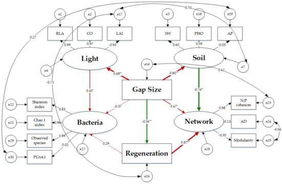 A structural equation model was established to explore the significant effects of gap size; soil physicochemical index (SW, PHO, AP); light properties (RLA, CO, LAI); soil bacteria composition (first axis of principal coordinate analysis, Shannon, observed species richness, and Chao1 indices); network complexity (Modularity, AD, N/P cohesion); and tree regeneration (regeneration density). Significant codes “***” indicate the p value < 0.001, “*” indicates the p value < 0.05.