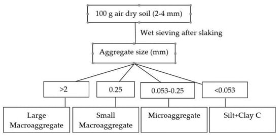 The 8 mm sieved soils were passed through a set of three sieves with the sizes of 2, 0.25 and 0.053 mm [,]. For the separation of soil aggregates, 100 g soil was initially placed over a 2 mm sieve in a Yoder apparatus, so that the set of sieves were completely immersed in water, and it was shaken vertically for 20 min. Large macroaggregate (LMA > 2 mm), small macroaggregate (SMA, 0.25–2 mm), microaggregate (mA, 0.053–0.25 mm) and CSA-sized fractions (< 0.053 mm) were separated in individual sieves and transferred to pre-weighed filter papers (Figure 1). The aggregate samples thus collected were dried in an oven at 60 °C for 48 h, grounded to fine powder in a pestle and mortar and passed through a 0.2 mm sieve before total C analysis by the dry combustion method [].
