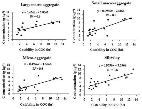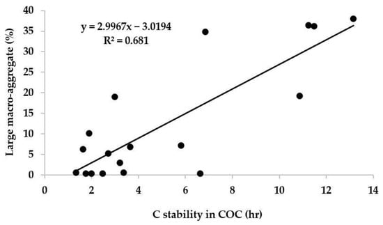The organic C fractions bind the individual soil particles into soil aggregates and subsequently into LMA formation [], which explains the positive relationship between COC and aggregate-associated C (Table 5). This result also implies that not only the aggregate-associated C, but also different SOC fractions had a significant role in the SOC stabilization process (Table 5). The COC contributed to 56–60% variability of C density in different aggregate size fractions (Figure 2). Further, CSA-associated C (r = 0.798, p < 0.01) was highly correlated with COC; this might be due to the fact that COC serves as the main component of the CSA fraction, which in turn stabilizes C in clay. Thus, organic C becomes physically protected within the aggregates [,] and chemically protected on clay surfaces by different bonding mechanisms [].