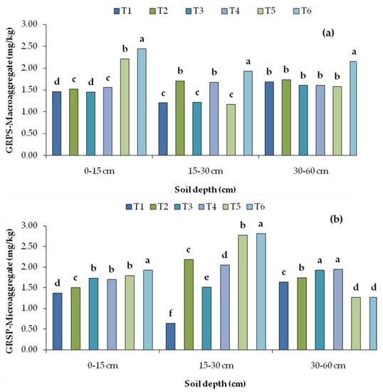 The GRSP concentration at surface soil (0–15 cm) varied from 1.45 to 2.45 and 1.37 to 1.93 mg kg−1 in macroaggregates, both large and small (>0.25 mm), and mA (<0.25 mm), respectively. The distribution of GRSP throughout the depth did not follow any trend. The application of organics significantly increased the GRSP concentration in both the aggregates, and it was recorded the highest in treatments where FYM, GM and BF were applied together (T6) on a long-term basis. The magnitude of increases for T6 over the control (T1) in macroaggregates and mA was 67 and 40%, respectively, at 0–15 cm, and 60 and 171%, respectively, at 15–30 cm depth (Figure 4). However, manure application for long-term effects in the GRSP allocation at 30–60 cm soil depth was highly variable and inconsistent.